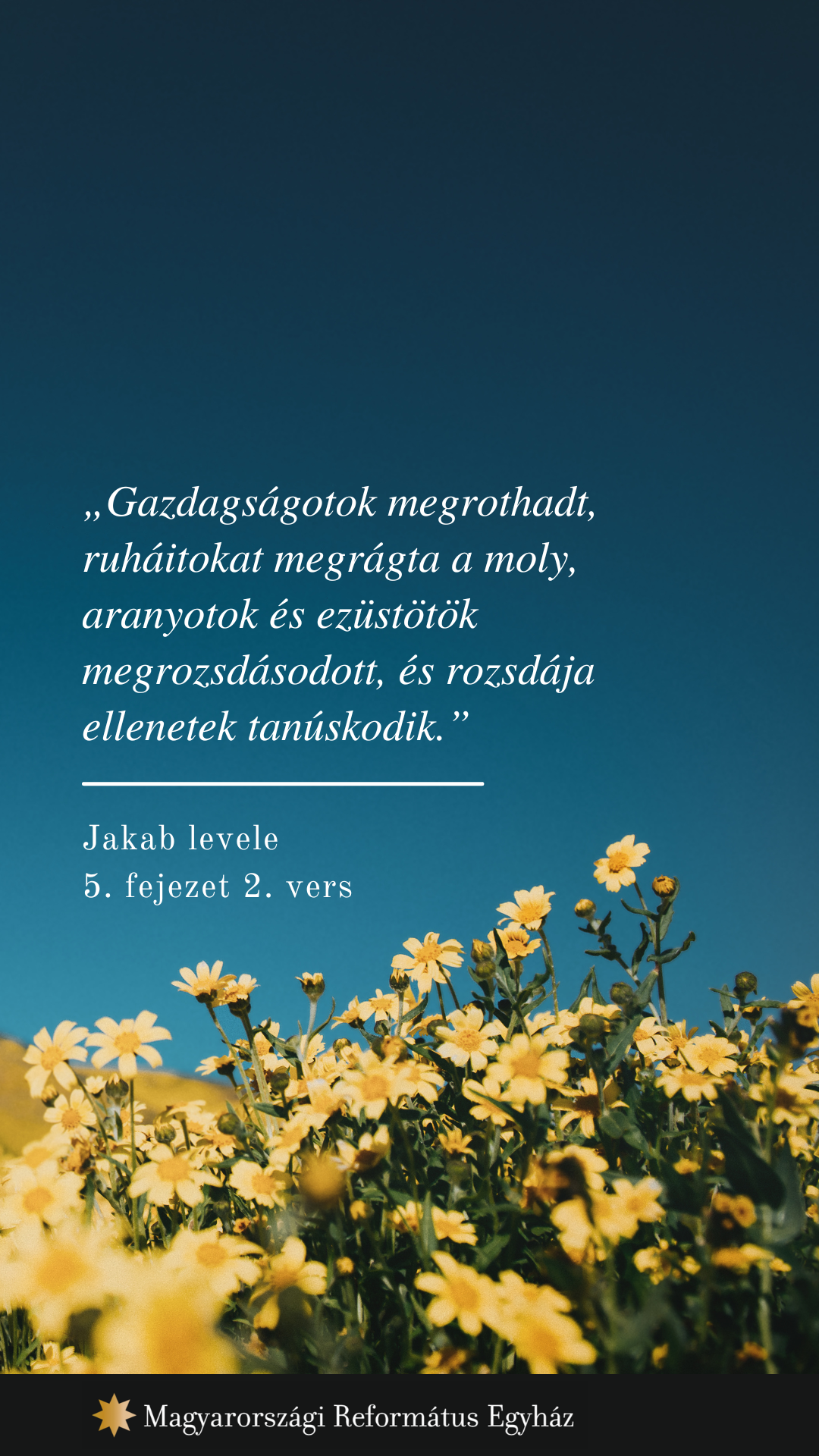 1 Most tehát, ti, gazdagok, sírjatok és jajgassatok a bekövetkező nyomorúságaitok miatt! 2 Gazdagságotok megrothadt, ruháitokat megrágta a moly, 3 aranyotok és ezüstötök megrozsdásodott, és rozsdája ellenetek tanúskodik, és megemészti testeteket, mint a tűz. Kincseket gyűjtöttetek még az utolsó napokban is. 4 Íme, a földjeiteket learató munkások bére, amelyet visszatartottatok, az égre kiált, és az aratók panasza eljutott a Seregek Urának a fülébe. 5 Dőzsöltetek a földön és tobzódtatok, hizlaltátok a szíveteket, mint az áldozati állat levágásának napján. 6 Elítéltétek, megöltétek az igazat, és ő nem állt ellen nektek.