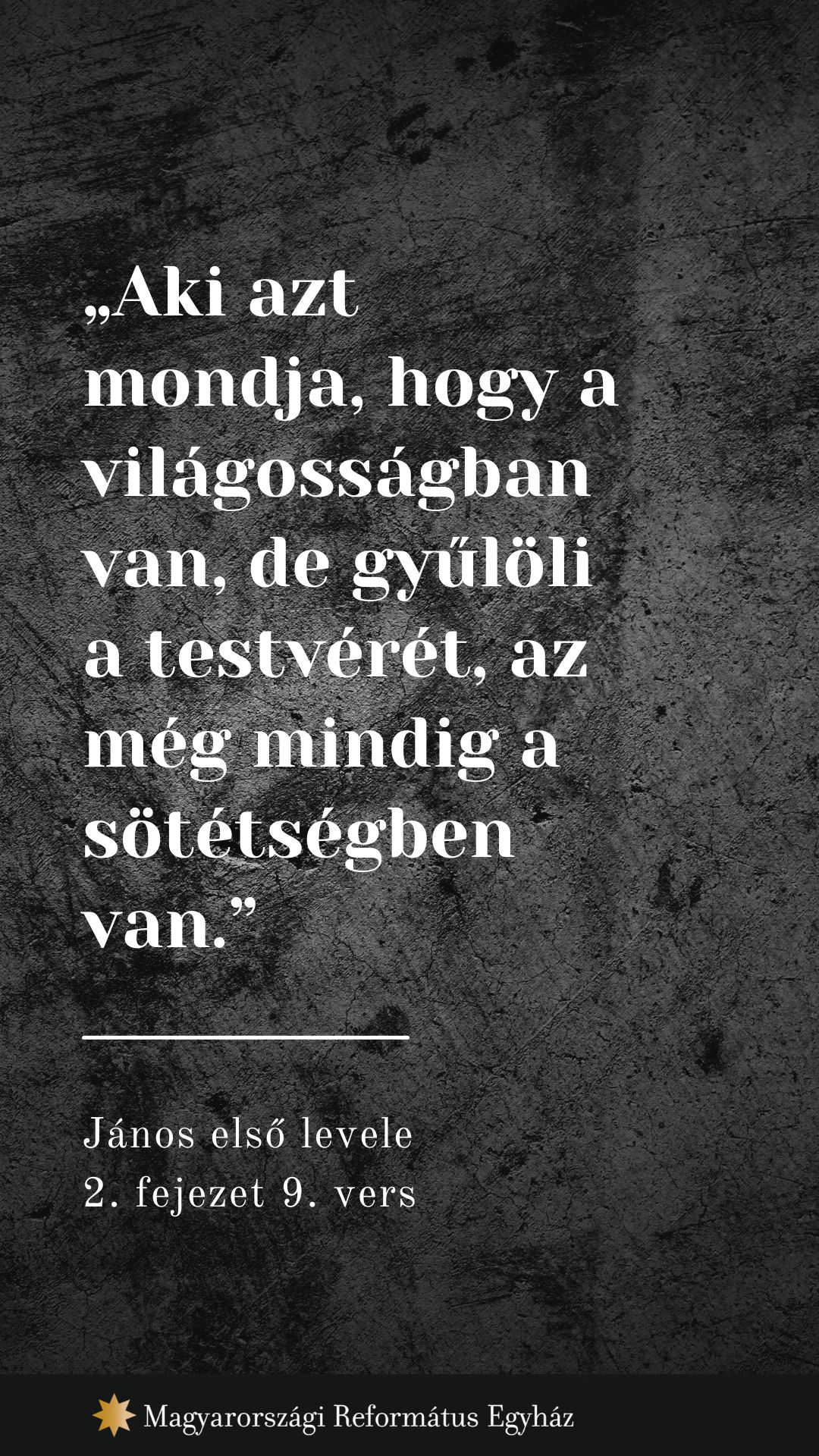 „Aki gyűlöli testvérét, az a sötétségben van” (11). A felebarát iránti szeretet parancsa az Ószövetségben is benne van (3Móz 19,18), de annak újszövetségi újdonsága az, hogy Jézus a bűnösöket is szerette, azokat is hívta és hívja új életre. A gyűlölet nem Istentől való. A gyűlölet teher, átok, betegségek melegágya. Csak Jézustól kaphatunk erőt, készséget arra, hogy ellenségeinket ne gyűlöljük, hanem szeressük (Mt 5,43–44).