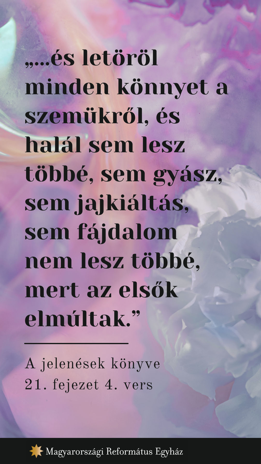 A 21. fejezetben olvashatjuk el az új teremtés valóságát. A megszentelt menyasszony, az egyház, a megújult emberiség az új Földön örök harmóniára talál a köztünk sátorozó Istennel. Könnyeinket letörlik. Krisztusban nemcsak azt pillanthatjuk meg, hogyan győz a jó, hanem végre azt is, hogyan uralkodik. Őbenne győzünk, ha vele együtt harcoltunk, hogy vele uralkodjunk. Ez túl van azon, amit még most el tudunk képzelni. De „ezek az igék megbízhatók és igazak” (5). Mondjuk rá áment!