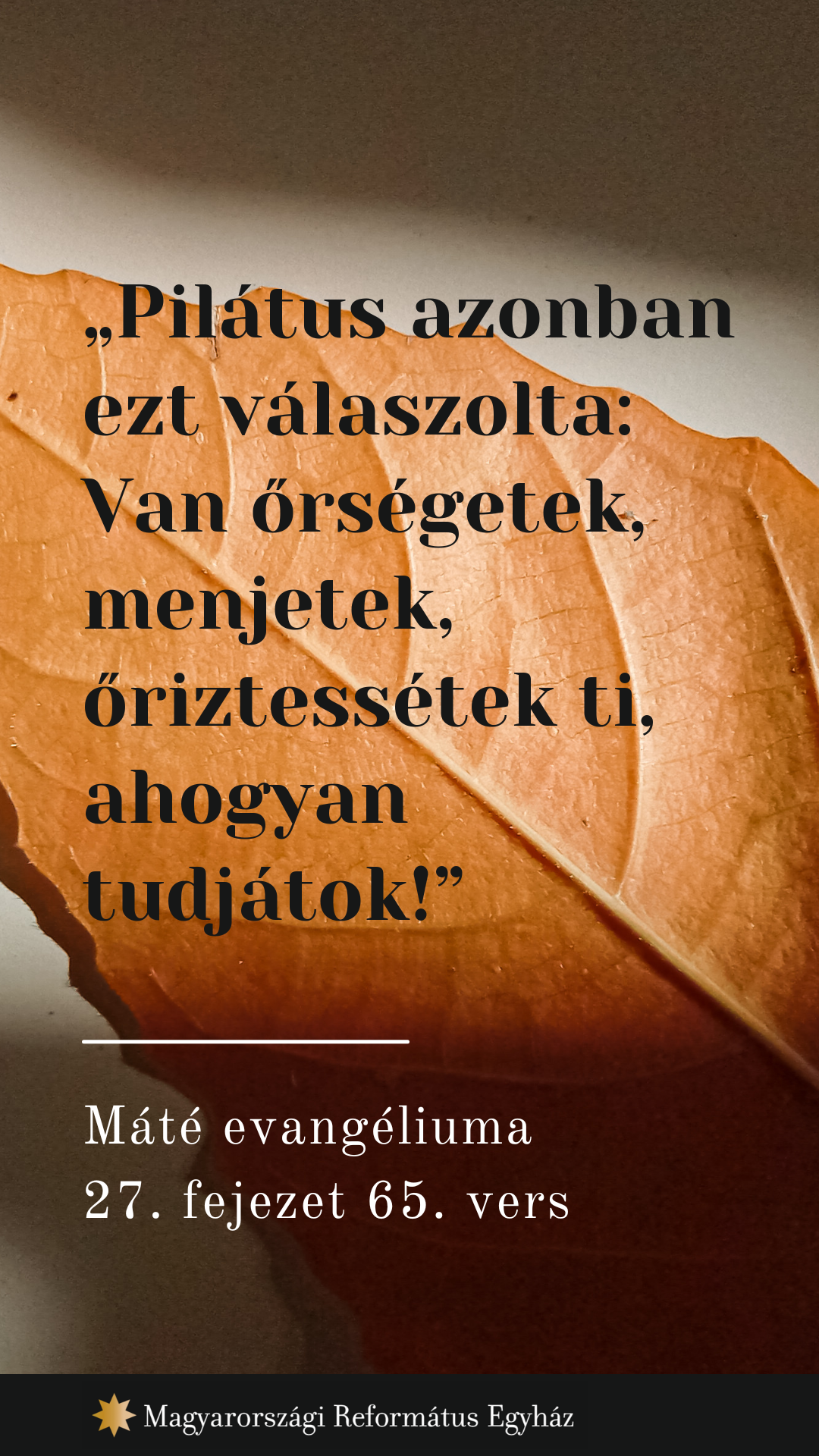 62 Másnap pedig, szombaton, összegyűltek a főpapok és a farizeusok Pilátusnál, 63 és így szóltak: Uram, eszünkbe jutott, hogy ez a csaló még életében ezt mondta: Három nap múlva feltámadok! 64 Ezért parancsold meg, hogy őrizzék a sírt a harmadik napig, nehogy tanítványai odamenjenek, és ellopják őt, azután azt mondják a népnek: Feltámadt a halottak közül! Ez az utóbbi csalás rosszabb lenne az előzőnél. 65 Pilátus azonban ezt válaszolta: Van őrségetek, menjetek, őriztessétek ti, ahogyan tudjátok! 66 Ők pedig elmentek, lepecsételték a követ, és őrséggel őriztették a sírt.