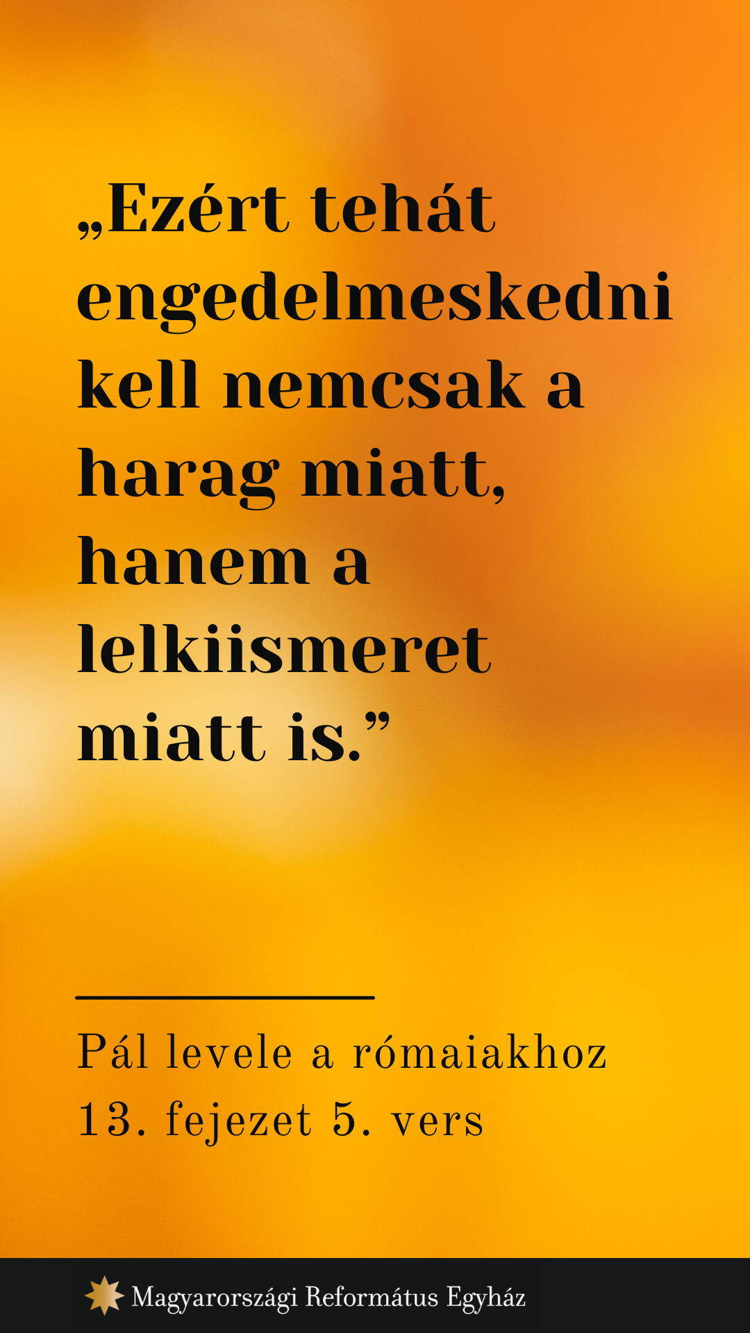 „Ezért tehát engedelmeskedni kell nemcsak a harag miatt, hanem a lelkiismeret miatt is.” Róm 13,1–7