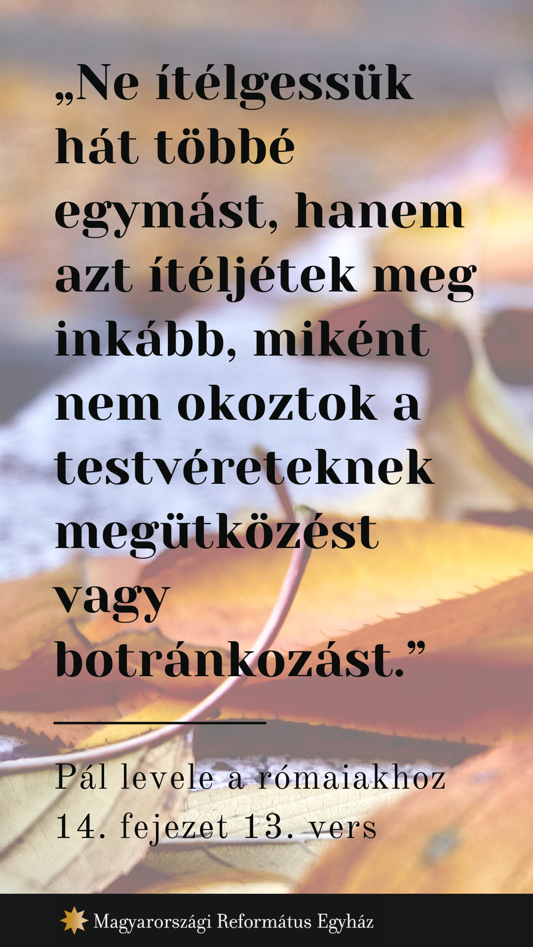 13 Ne ítélgessük hát többé egymást, hanem azt ítéljétek meg inkább, miként nem okoztok a testvéreteknek megütközést vagy botránkozást. 14 Tudom, és meg vagyok győződve az Úr Jézus által, hogy semmi sem tisztátalan önmagában, hanem csak ha valaki valamit tisztátalannak tart, annak tisztátalan az. 15 Ha pedig testvéred valamilyen étel miatt megszomorodik, máris letértél a szeretet útjáról: ne tedd tönkre ételeddel azt, akiért Krisztus meghalt. 16 Vigyázzatok, ne káromolják azt a jót, amelyben részesültetek. 17 Hiszen az Isten országa nem evés és ivás, hanem igazság, békesség és öröm a Szentlélekben, 18 mert aki így szolgál Krisztusnak, az kedves Isten előtt, és megbízható az emberek előtt. 19 Arra törekedjünk tehát, ami a békességet és az épülést szolgálja. 20 Étel miatt ne rombold le az Isten munkáját. Minden tiszta ugyan, de rossz annak az embernek, aki megütközéssel eszik. 21 Jobb tehát nem enni húst, nem inni bort és semmi olyat, amin testvéred megütközik. 22 Te azt a hitet, amely benned van, tartsd meg Isten előtt. Boldog, akinek nem kell elítélnie önmagát abban, amit helyesel. 23 Akinek viszont kétségei vannak, amikor eszik, máris megítéltetett, mivel nem hitből teszi. Mert mindaz, ami nem hitből van, bűn.