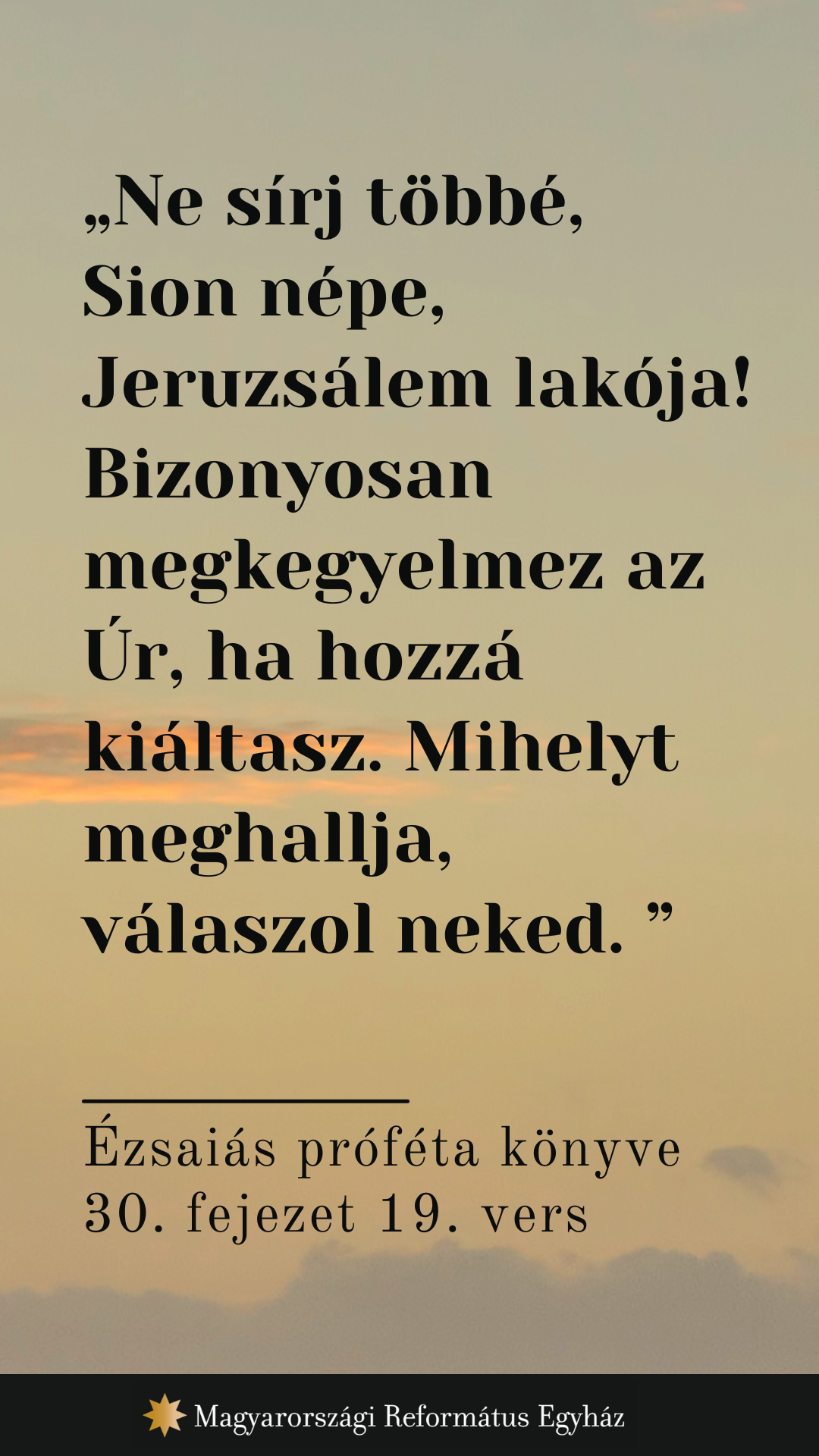 19 Ne sírj többé, Sion népe, Jeruzsálem lakója! Bizonyosan megkegyelmez az Úr, ha hozzá kiáltasz. Mihelyt meghallja, válaszol neked. 20 És bár szűkösen adott kenyeret, és kimérte a vizet az Úr, nem állítják többé félre tanítódat, hanem saját szemeddel láthatod tanítódat. 21 Saját füleddel hallhatod a mögötted hangzó szót: Ezen az úton járjatok, se jobbra, se balra le ne térjetek! 22 Tisztátalannak fogod tartani az ezüsttel bevont bálványaidat és az arannyal borított istenszobraidat. Kihajítod azokat, mint valami undorító dolgot, ezekkel a szavakkal: Ki innen veletek! 23 Ő pedig esőt ad a magra, amellyel beveted a földed, és kenyeret ad a föld terméséből, amely bőséges és tápláló lesz. Nyájad tágas mezőn legel azon a napon. 24 Az ökrök és a szamarak, amelyek a szántóföldön dolgoznak, sózott abrakot esznek, amelyet lapáttal és villával raknak majd eléjük. 25 Minden magas hegyen és kiemelkedő halmon pedig csatornák lesznek, vízvezető árkok, a nagy öldöklés napján, amikor leomlanak a vártornyok. 26 Olyan lesz a sápadt hold fénye, mint az izzó nap fénye, az izzó nap fénye pedig hétszeres lesz, a nappali fény hétszerese azon a napon, amikor az Úr bekötözi népe sérülését, és meggyógyítja a rajta ejtett sebet. 27 Maga az Úr jön a távolból, haragja lángol, egyre emelkedik, méltóságteljesen. Ajkán bősz harag, nyelve, mint a perzselő tűz, 28 lehelete olyan, mint az áradó patak, amely az ember nyakáig ér. Szakadozott rostában rostálja a népeket, és tévútra vezető zablát vet a népek szájába. 29 Akkor majd úgy fogtok énekelni, mint az ünnepszentelés éjjelén, és szívből örvendeztek majd, mint a zarándok, aki fuvolaszó mellett az Úr hegyére, Izráel Kősziklájához érkezik. 30 Fölmorajlik az Úr fenséges szava, láthatóvá lesz sújtó karja, felbőszült haragjában, perzselő tűz lángjában, orkánban, zivatarban és jégverésben. 31 Asszíria megretten az Úr szavától, aki bottal sújt le rá! 32 Valahányszor lesújt a büntető vessző, amellyel veri az Úr, dob és citera szól, míg ő harcra emelt kézzel küzd ellene. 33 Mert régóta készen van a vesztőhely, készen áll a királynak is, mélyre és szélesre készítve, bőven van tűz is, fa is. Az Úr lehelete úgy lobbantja lángra, mint egy kénköves patakot.