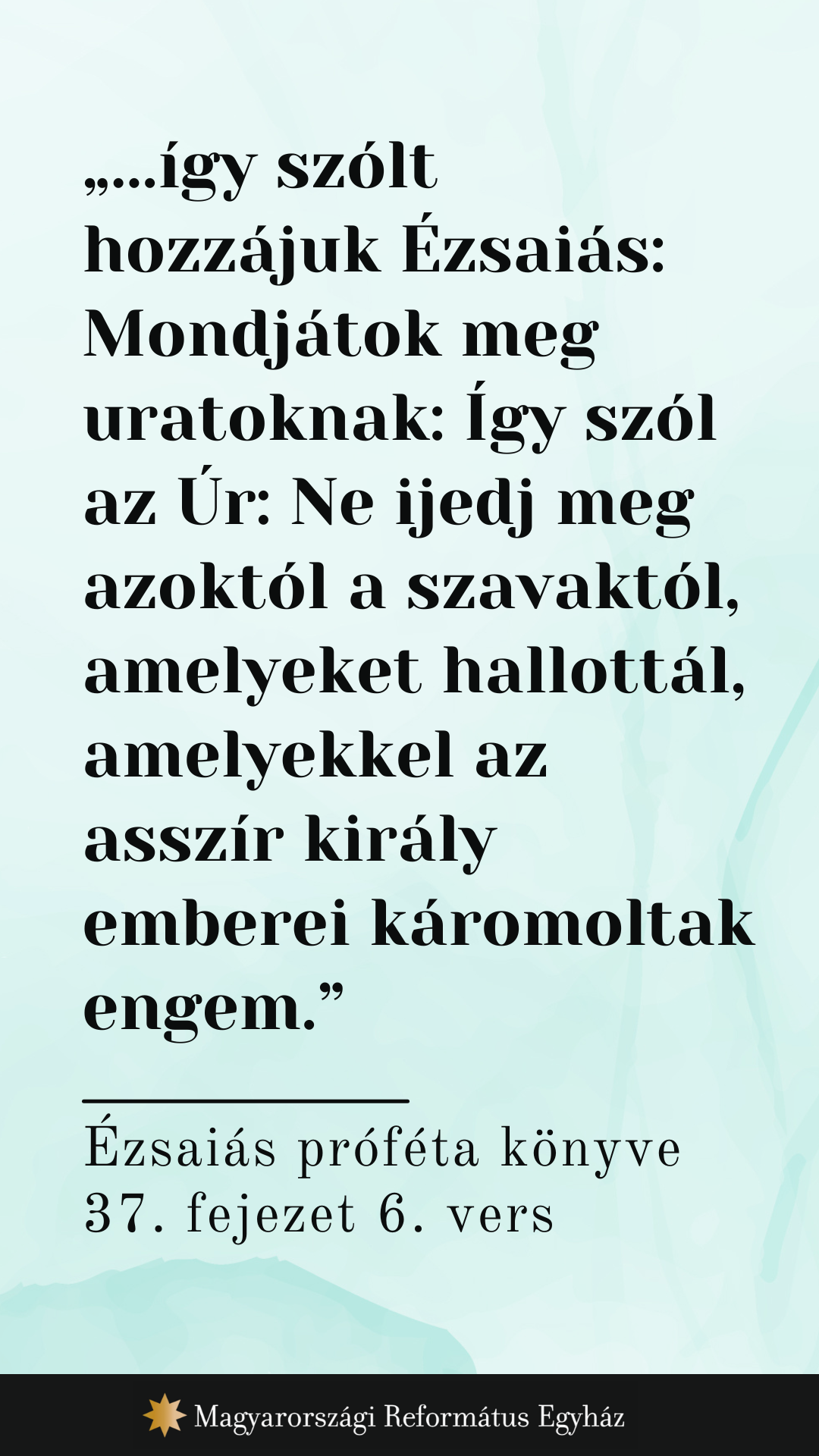 Mai Igénk az előző fejezetben leírtak folytatása. Ezékiás fenyegető levelet is kapott az asszír király megbízottjától. Tartalmára nézve ultimátumot. Arról szólt, milyen súlyos következménye lesz annak, ha Jeruzsálemet nem adják át harc nélkül az asszíroknak. Lélektani hadviselés. Elvenni az ostromlandó város lakosságának reménységét. Intő példaként utalt az asszírok győztes háborúira. Ez a sors vár majd Júda népére is, mert nem lesz, aki segítsen. Mit lehet ilyen helyzetben tenni, amikor szóban és írásban világosan tudtára adták Ezékiás királynak, hogy nincs értelme semmiféle ellenállásnak? Nos, nem tartott sietve haditanácsot. Nem osztotta ki a feladatokat, hogy ostrom esetén kinek mi a teendője. A fenyegető levelet bevitte a templomba. Kiterítette, s ezzel mintegy bemutatta Istennek: lásd, Uram, ezt mondják a tények. Olyan itt a király, mint a gyermek, aki a törött játékát az édesapja kezébe teszi – azzal a bizalommal, hogy ő biztosan tud megoldást találni rá. Lett megoldás. Isten Ézsaiás által szabadulást ígért. Maga az Úr lesz pajzsa a városnak (35). Éjjel az Úr angyala levágott száznyolcvanötezer asszírt, királyuk pedig elvonult onnan. Fenyegető helyzetünkkel, csorbult reménységünkkel járuljunk az Úr elé!
