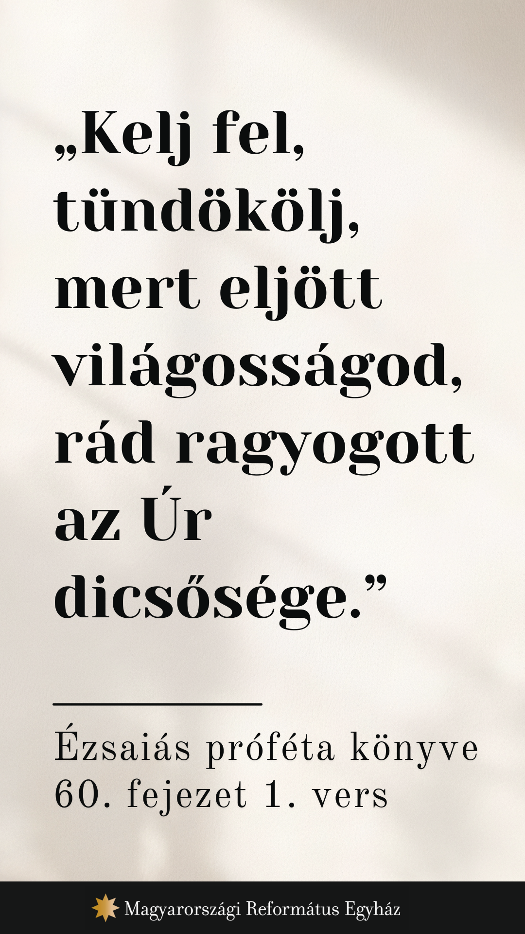 „Kelj fel, tündökölj, mert eljött világosságod, rád ragyogott az Úr dicsősége.” Ézs 60