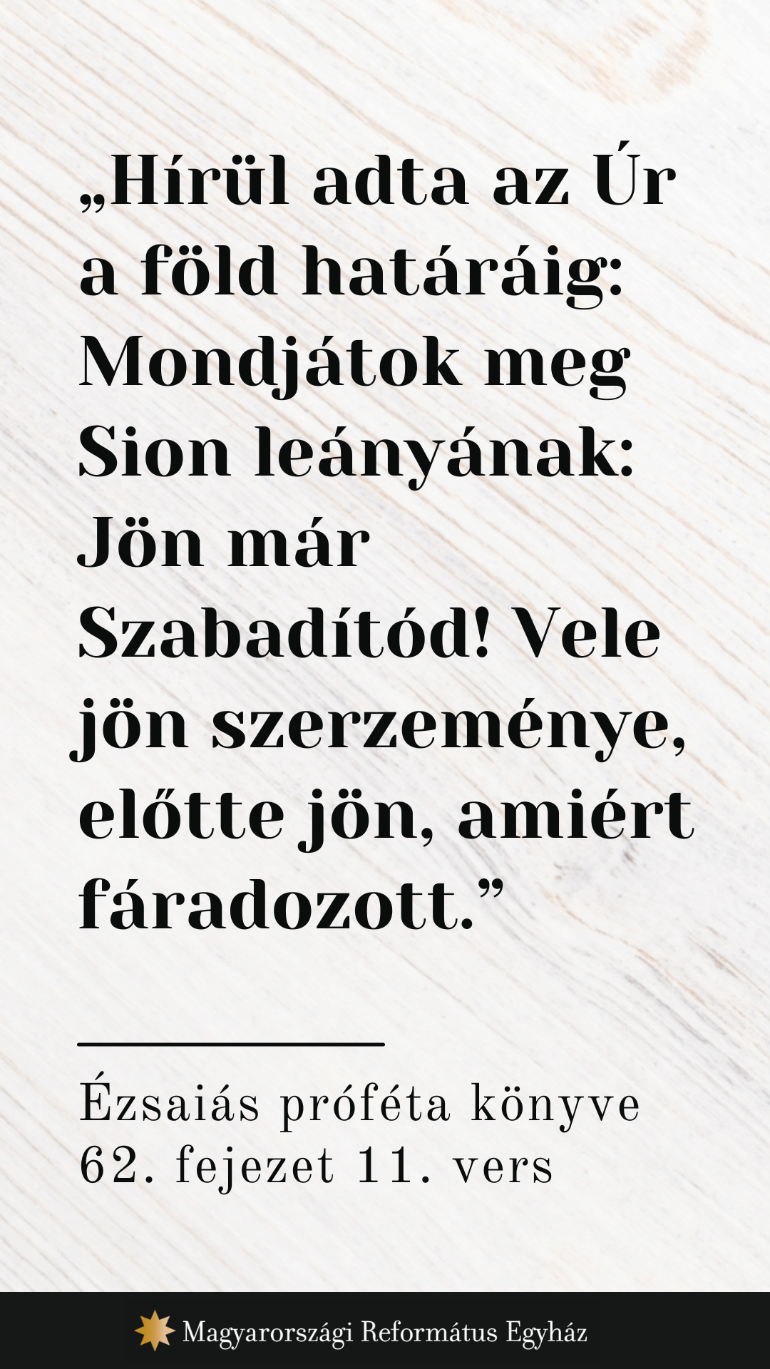 1 Nem hallgathatok Sion miatt, nem nyughatom Jeruzsálem miatt, míg nem ragyog igazsága, mint a hajnalfény, és szabadulása, mint az égő fáklya. 2 Látni fogják igazságodat a népek, dicsőségedet az összes király. Új neveden szólítanak téged, amelyet az Úr maga ad majd neked. 3 Ékes korona leszel az Úr kezében, királyi fejdísz Istened tenyerén. 4 Nem mondanak többé elhagyottnak, országodat sem mondják pusztaságnak, hanem úgy hívnak, hogy gyönyörűségem, országodat pedig úgy, hogy férjnél van. Mert gyönyörködik majd benned az Úr, és országodnak ő lesz a férje. 5 Mert ahogy az ifjú elveszi a hajadont, úgy vesz el téged, aki felépít; ahogy a vőlegény örül menyasszonyának, úgy örül majd neked Istened. 6 Falaidra, Jeruzsálem, őröket állítottam. Soha ne hallgassanak, se nappal, se éjjel! Ti, akik az Urat emlékeztetitek, ne legyetek némák! 7 Ne engedjétek, hogy néma maradjon, amíg helyre nem állítja és dicséretre méltóvá nem teszi Jeruzsálemet a földön. 8 Az Úr esküre emelte jobb kezét, erős karját: Nem adom többé gabonádat eledelül ellenségeidnek. Nem isszák többé idegenek mustodat, amelyért te fáradoztál, 9 hanem azok élvezik, akik betakarítják, és dicsérik az Urat, azok isszák meg szent udvaraimban, akik leszüretelik. 10 Vonuljatok, vonuljatok ki a kapukon, építsetek utat a népnek! Töltsétek, töltsétek föl az országutat, hányjátok le róla a köveket, állítsatok útjelzőket a népek között! 11 Hírül adta az Úr a föld határáig: Mondjátok meg Sion leányának: Jön már Szabadítód! Vele jön szerzeménye, előtte jön, amiért fáradozott. 12 Szent népnek nevezik őket, az Úr megváltottainak, téged pedig sokat látogatott városnak hívnak, nem pedig elhagyatottnak!