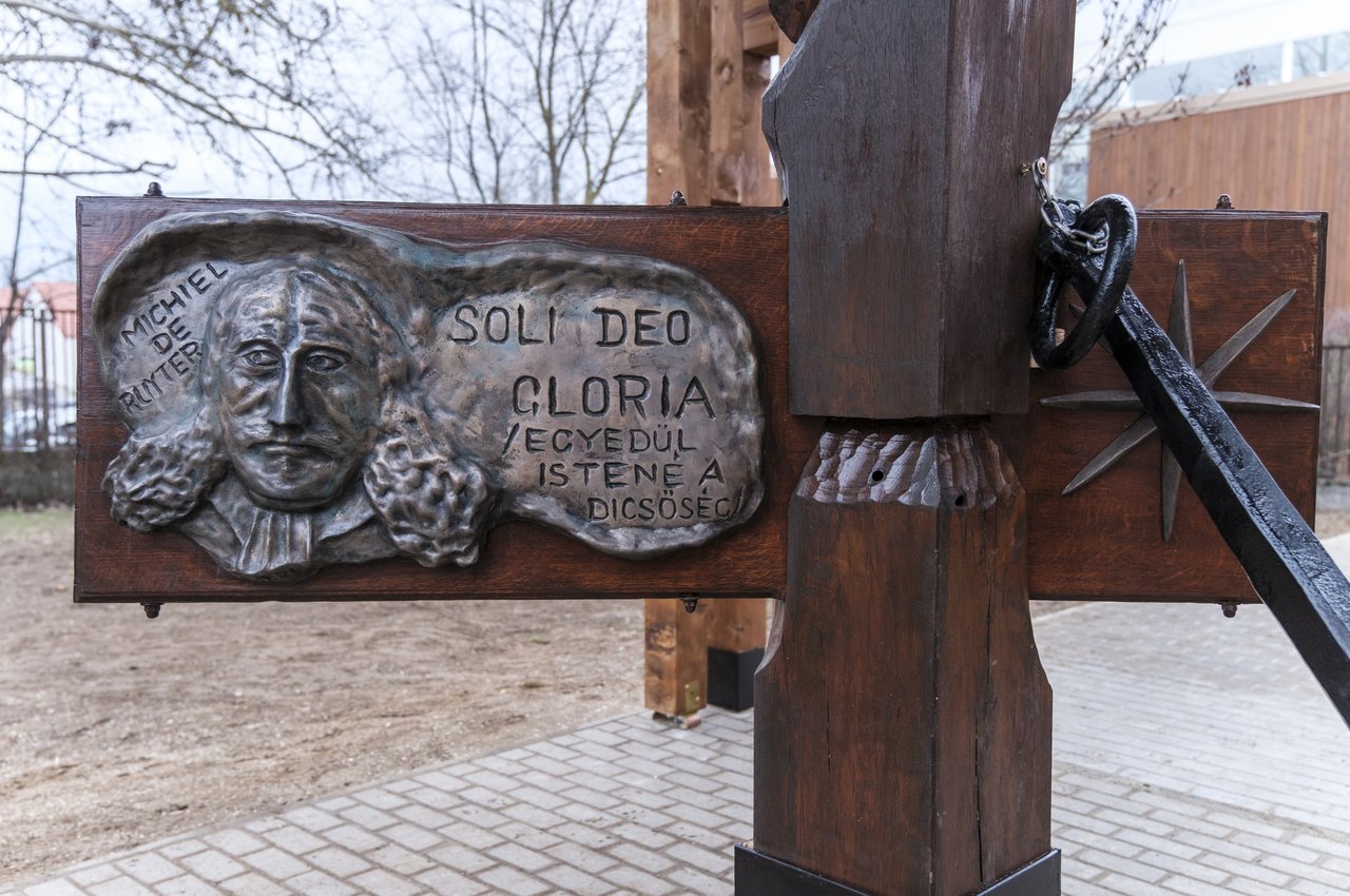 A tábori lelkész szolgálatában az emlékmű történetéről is szó esett. Elhangzott, hogy a szoborkompozíció eredetileg a Zrínyi Miklós Nemzetvédelmi Egyetem Bolyai János Katonai Műszaki Főiskolájában állt, majd az intézmény lerombolása után a Bolyai János Alapítvány a Protestáns Tábori Püspökségnek ajándékozta azt. Az emlékmű hosszú éveken át várta sorsa jobbra fordulását, mígnem a debreceni református tábori lelkész közbenjárásával és a Debrecen-Bánki Református Egyházközség áldozatvállalásával újra méltó helyre kerülhetett. A szoborkompozíció alkotója Berek Lajos mérnök ezredes, a Bolyai János Katonai Műszaki Főiskola egykori dékánja, Mednyánszky-díjas szobrász, a bronz dombormű öntője Varga Lajos karcagi öntőmester. A kopjafa, a gálya és a horgony szimbolikája, valamint Michiel de Ruyter admirális arcképe a mártírok hitvalló életét és szabadulását idézi meg.
